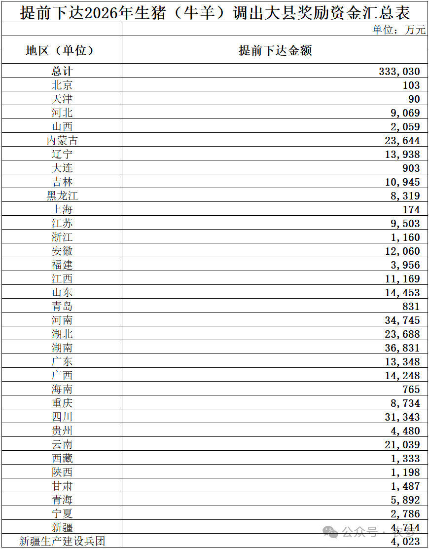 附件:提前下達2026年生豬(牛羊)調(diào)出大縣獎勵資金匯總表
